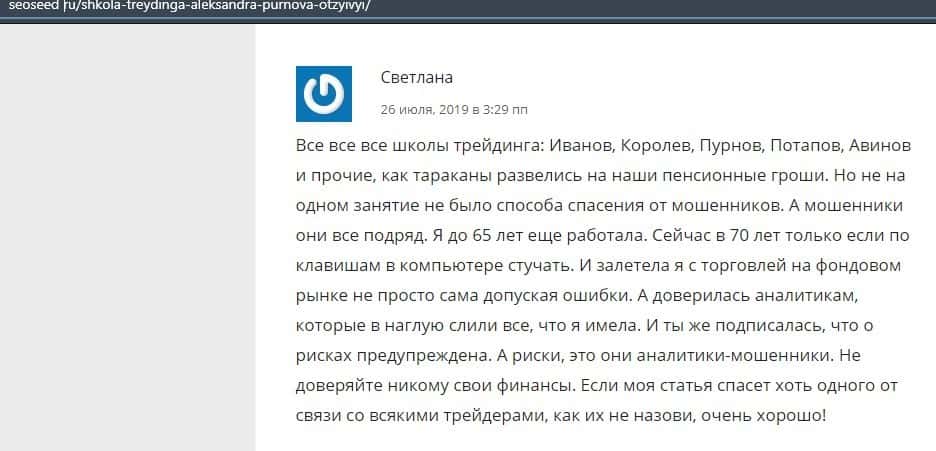 Автор следующей публикации указывает, что контора Школа трейдинга Александра Пурнова была создана для того, чтобы выманивать деньги у клиентов. Поэтому это школа для лохов.