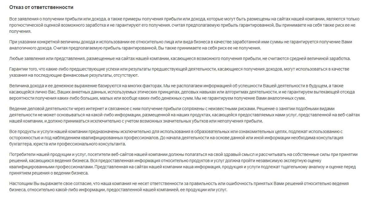 Далее представлен документ под названием Отказ от ответственности, так как лохотрон AlexanderPurnov не удосужился предоставить на сайте ни договора, ни соглашения.