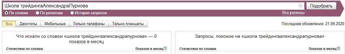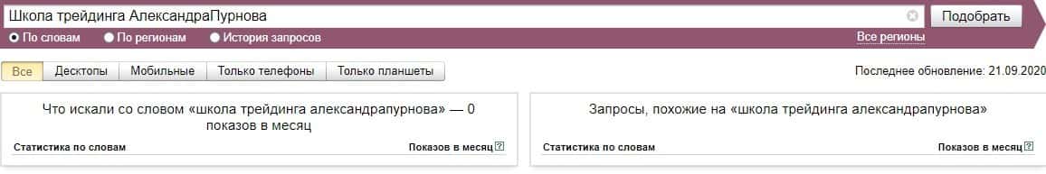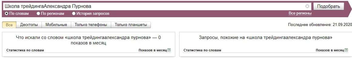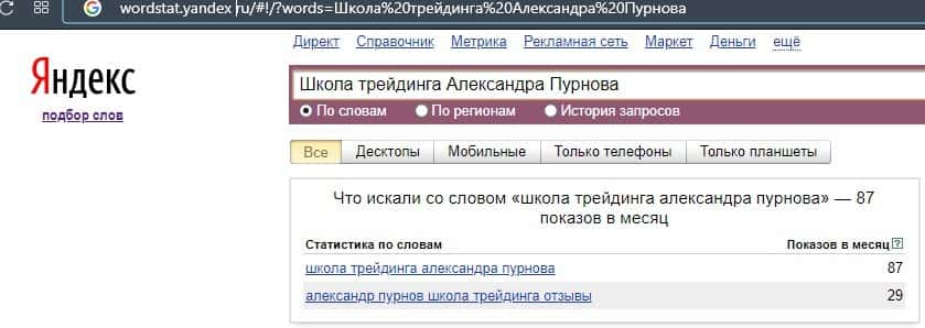 Бренд "Школа трейдингаАлександра Пурнова" по версии Яндекс Вордстат также не популярен, так как лохотрон не смог найти ни единого показа за последний месяц.