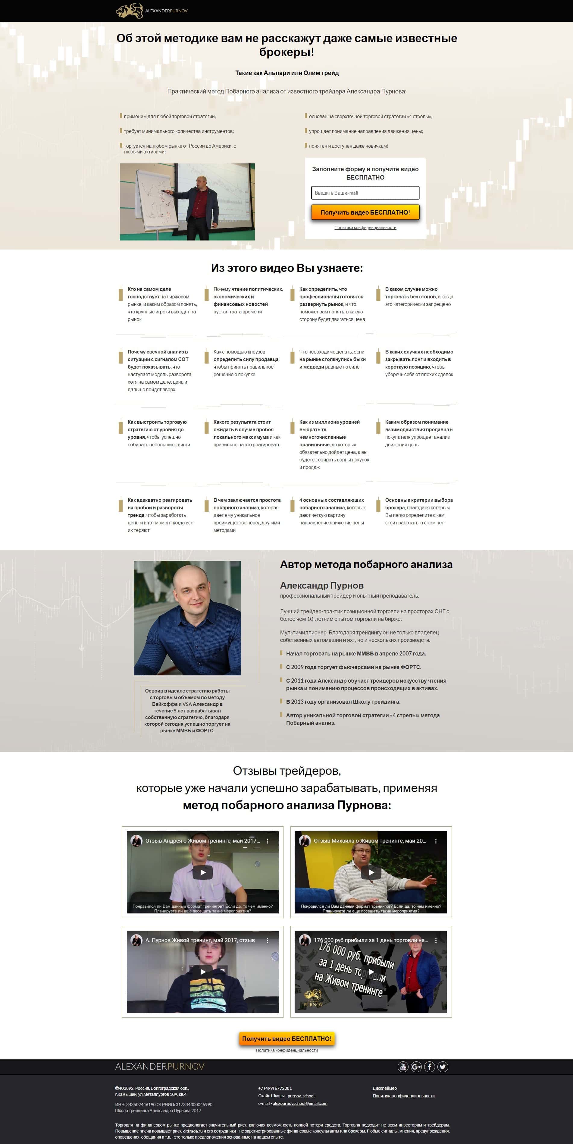 Школа трейдинга Александра Пурнова - очередная псевдо-школа, которая предлагает наивным лохам обучение трейдингу на рынке Форекс. Главным инфоцыганом выступает некий гражданин Российской Федерации, который обрабатывает и обворовывает русскоязычное население, при чем без лицензии и разрешения на это. Также лохотрон имеет множество подставных сайтов в разном оформлении, но все с той же сутью - продать свой псевдо-курс. Отзывы в сети говорят сами за себя и они продают попросту пустышку, которую можно найти в интернете бесплатно. Поэтому ни при каких обстоятельствах не связывайтесь с этой недошколой AlexanderPurnov.