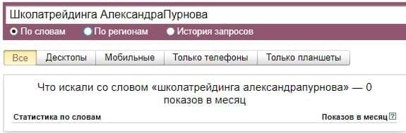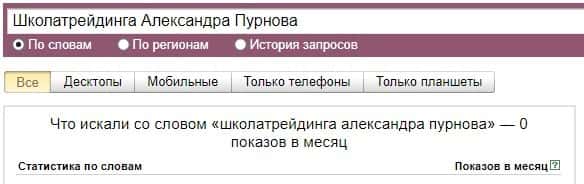 Та же история и с брендом "Школатрейдинга АлександраПурнова". По версии Яндекс Вордстат, лохотрон так и не смог набрать достаточного количества показов.