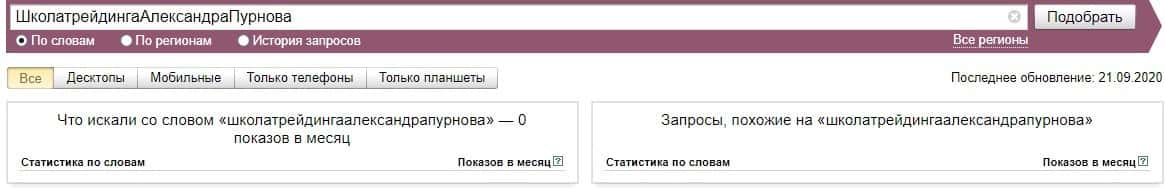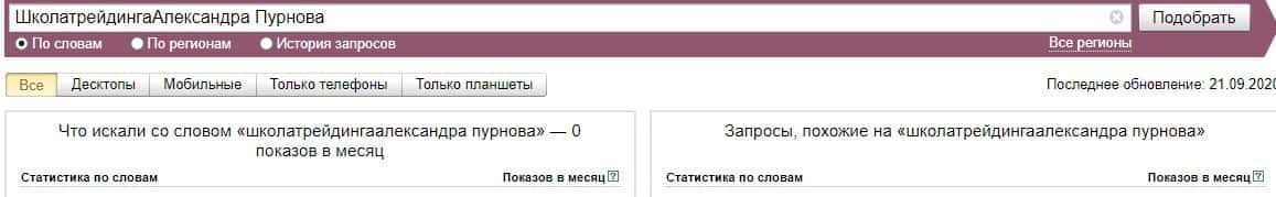 Что касается бренда "Школатрейдинга Александра Пурнова" в другом виде, то здесь такая же ситуация - ни одного показа согласно популярной поисковой системы Гугл.