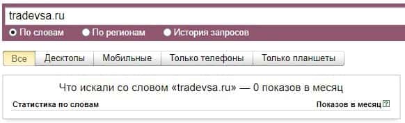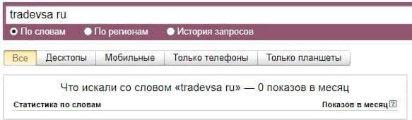 Если взять и пробить в Яндекс.Вордстат чисто домен сайта без точки "tradevsa ru", то система выдает нам 0 показов за последний месяц.