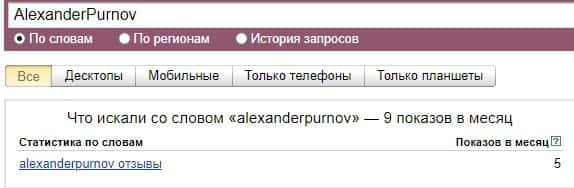 Далее представлена информация по запросам бренда "AlexanderPurnov", который по Яндекс.Вордстат набрал значение в 9 показов за месяц.