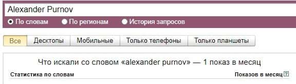 Что касается бренда "Alexander Purnov", то здесь ситуация также плачевная и Яндекс Вордстат смог обнаружить только 1 показа за последний месяц.