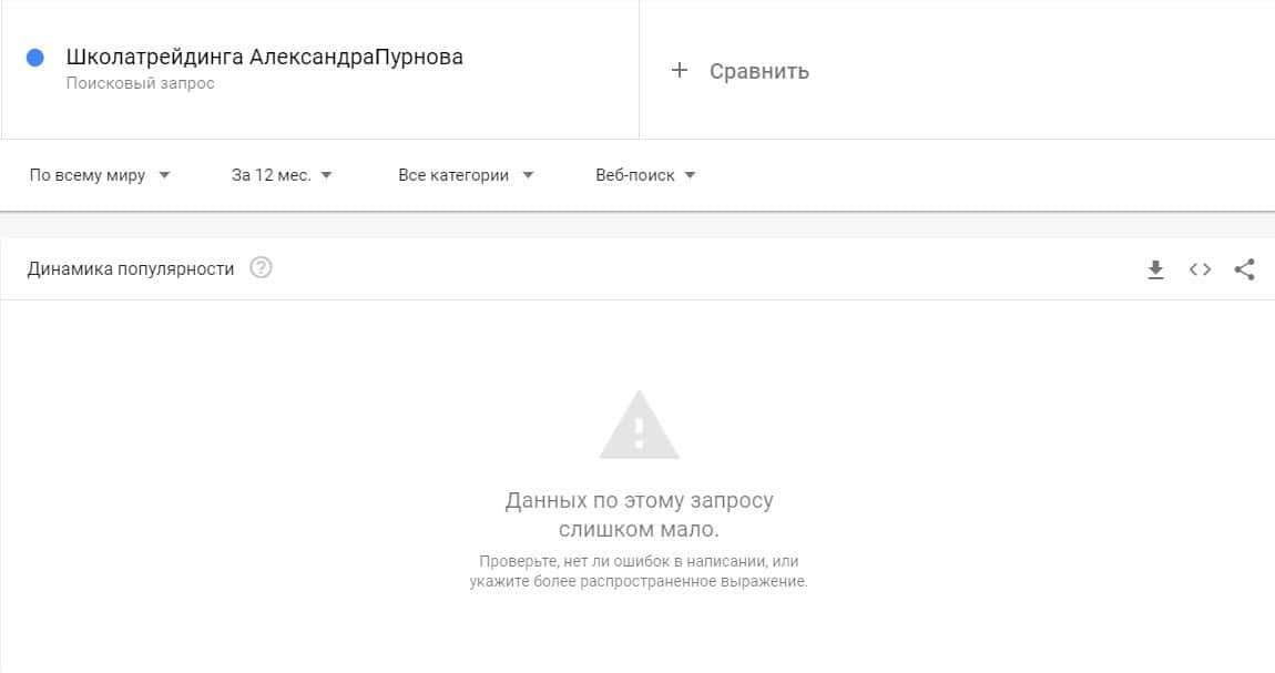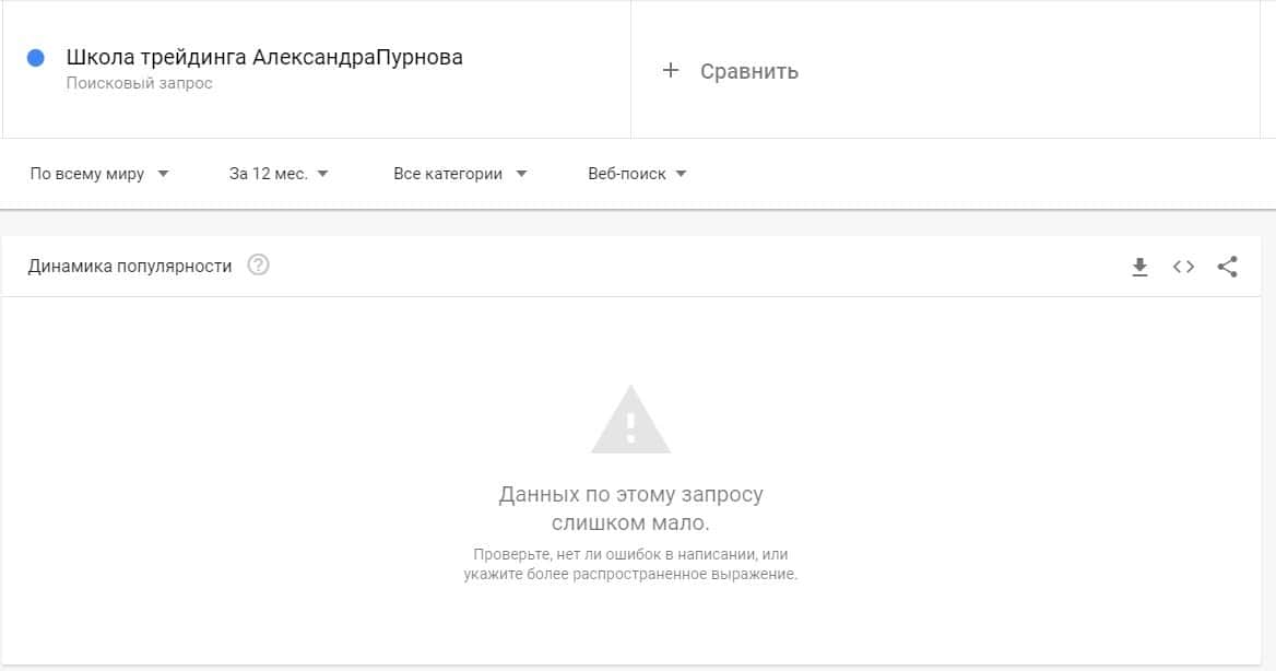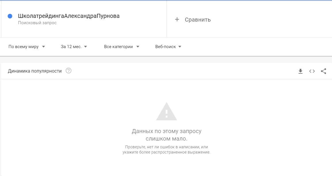 И такая же история с брендом "Школатрейдинга АлександраПурнова". Гугл Трендс не обнаружил не единого запроса в поисковой системе Гугл за последний месяц.