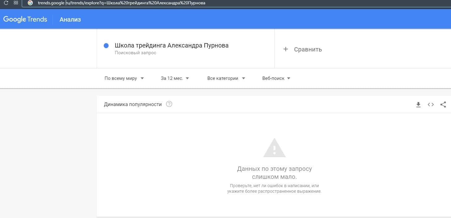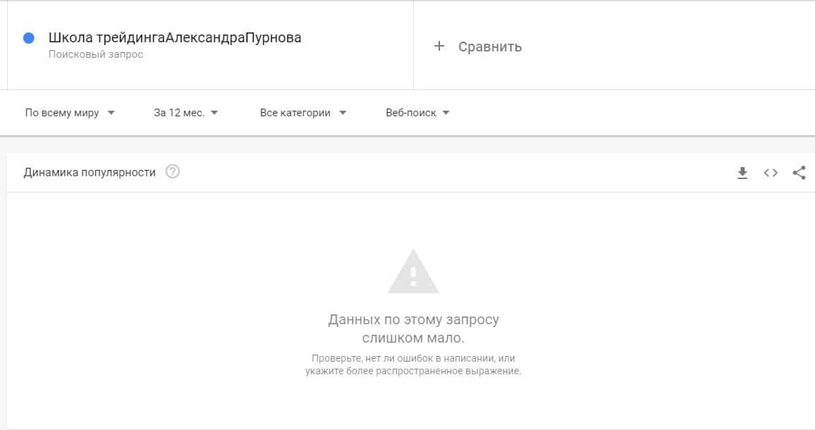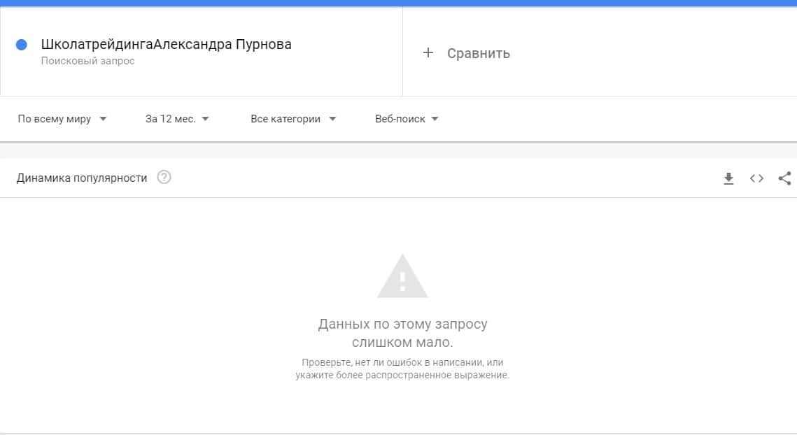 Версия бренда "Школа трейдинга АлександраПурнова" не набрала также никаких данных, так как аферисты в Гугл Трендс не смогла получить достаточно показов.