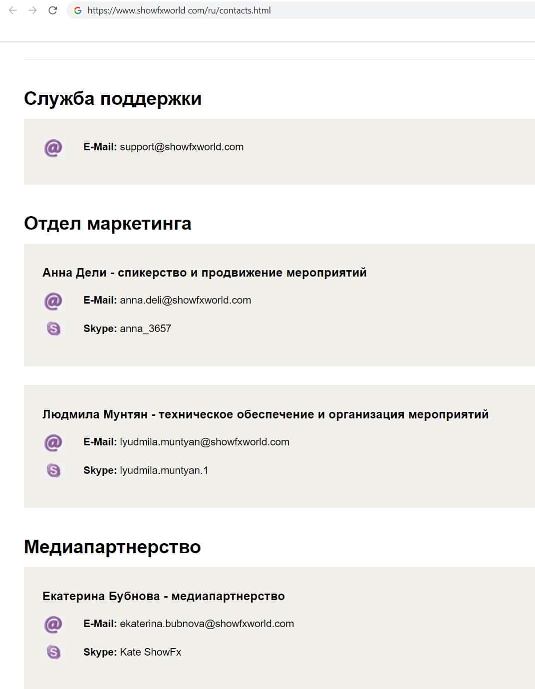 - Контактная информация мошеннической фирмы ShowFxWorld