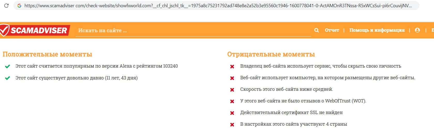 - Мнение интернет ресурса scamadviser com о конторе лохотронщиков ShowFxWorld