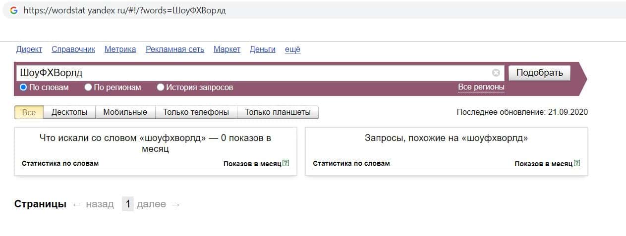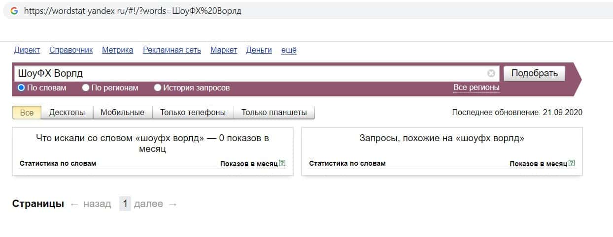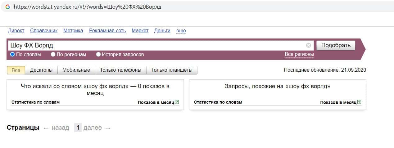 Мы так же решили проверить и количество запросов компании Шоу ФХ Ворлд по русскоязычному названию с одним пробелом, а именно "ШоуФХ Ворлд". Но результата - ноль.