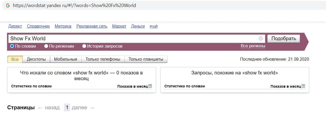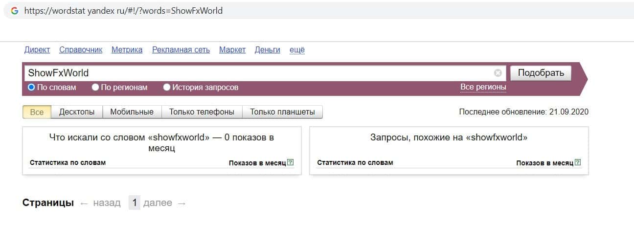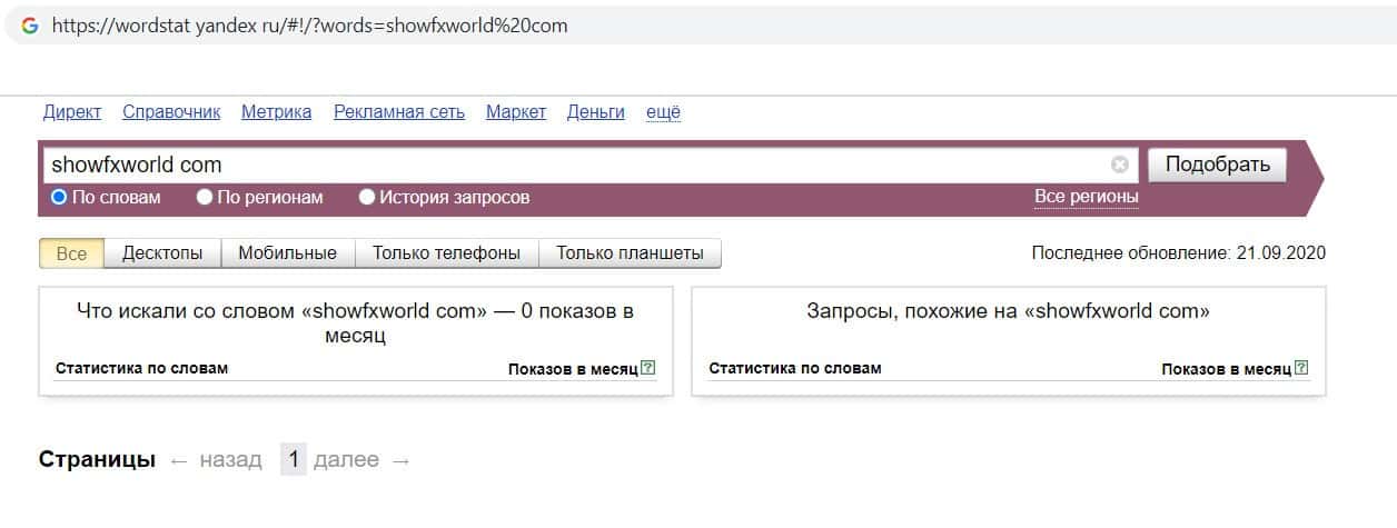 Мы проверили количество запросов компании ShowFxWorld в Яндексе по названию фирмы, а именно "ShowFxWorld". Но данный запрос никто не выполнял в течении месяца.
