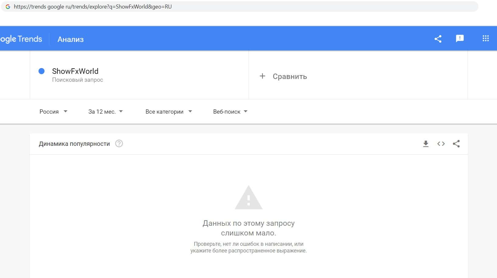 Так же мы проверили количество запросов фирмы аферистов ShowFxWorld по названию конторы с одним пробелом, а именно "ShowFx World". Но результат оказался нулевым.