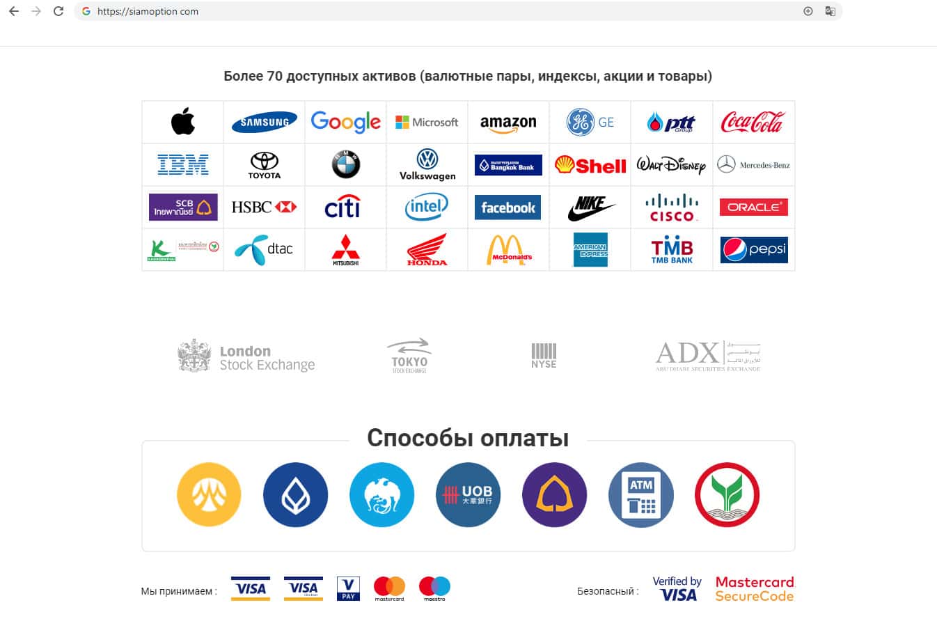 После этого компания разводил Siam Option рассказывает о своих 70 доступных активов (валютные пары, индексы, акции и товары), которыми жулики явно хвастается. Но это всё сплошной обман. Так же компания представляет способы оплаты, и тут они не мелочатся, сделали как можно больше вариантов что бы клиенты могли больше инвестировать.