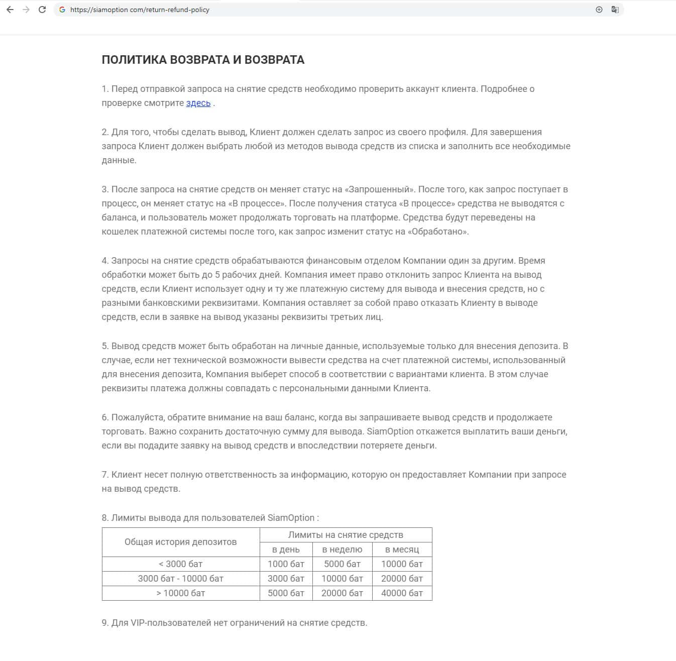 Лохотронщики Сиам Опцион предоставили некую политику возврата средств, в которой рассказывают как выводят и возвращают средства. Но указанно, что компания может отказать в выводе средств, если вы будете переводить их не на свою карту, так компания может найти тысячи причин, что бы отказать клиентам в выводе их средств.