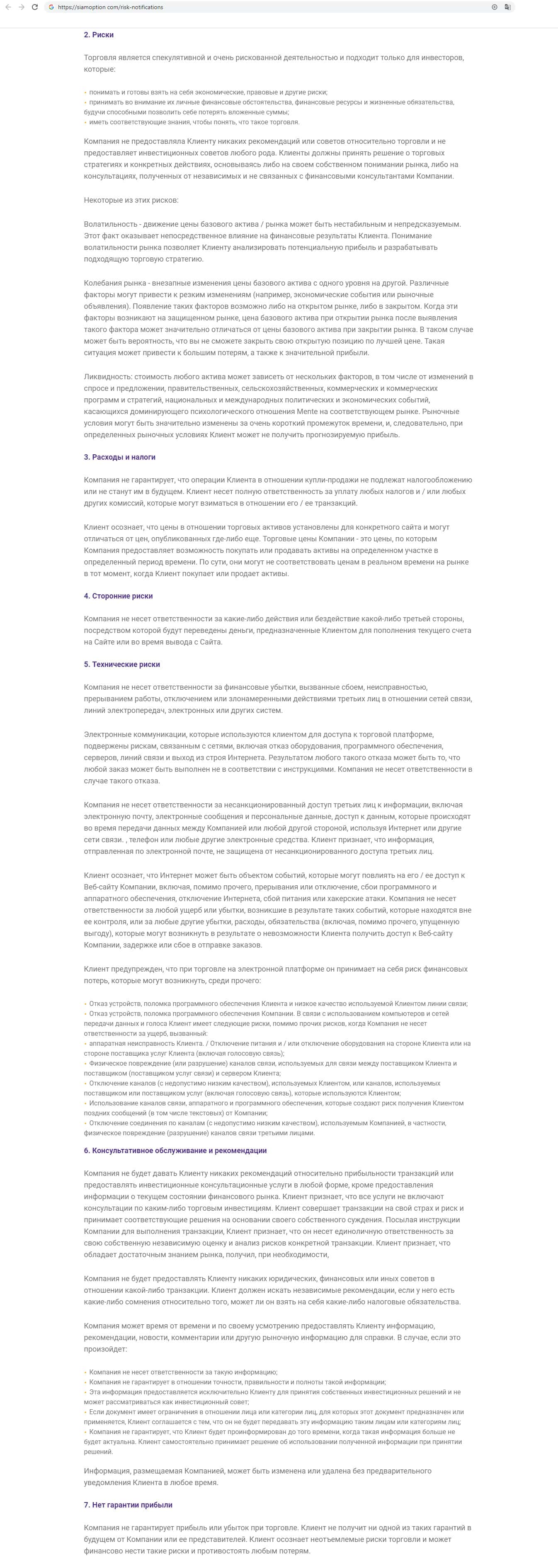 На сайте компании аферистов Сиам Опцион мы может найти так же документ под названием "уведомление о риске", в котором компания указывает риски, с которыми придётся столкнуться клиентам, так же в последнем пункте жулики отказываются от всей ответственности, говоря о том, что они не гарантируют никакой прибыли.