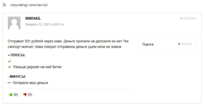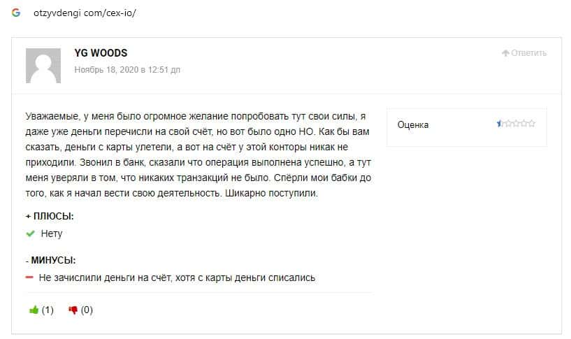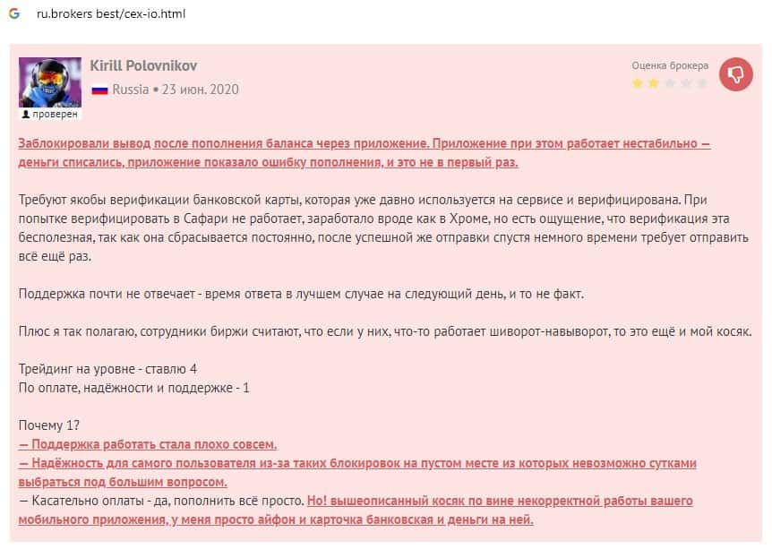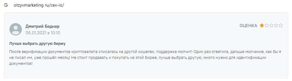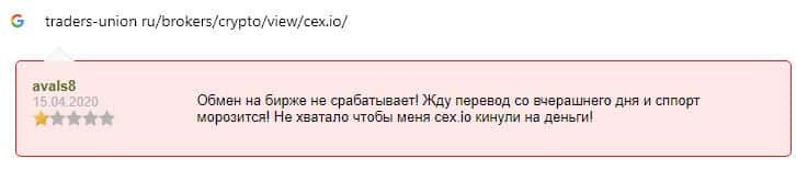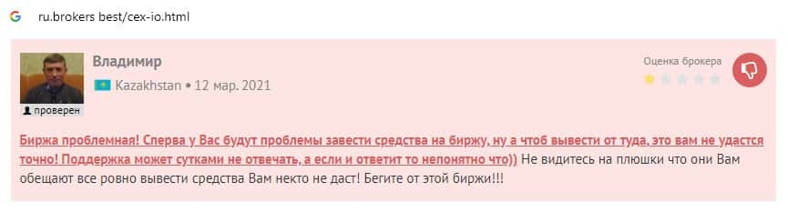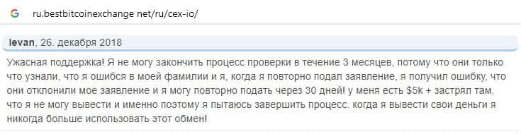 Ниже предоставлен еще один пользовательский отзыв о том, что на сайте криптовалютной биржи CEX отсутствует техподдержка и возникают проблемы с выводом средств.