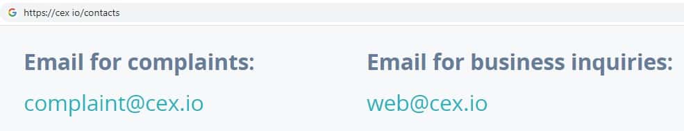 Жулики CEX на своем официальном онлайн-ресурсе указывают несколько адресов электронной почты, а именно: