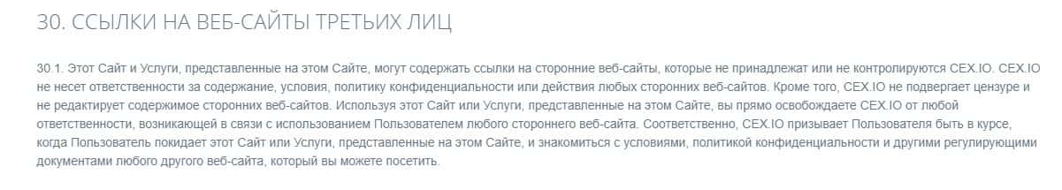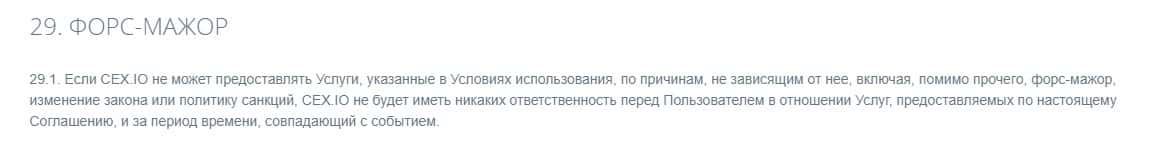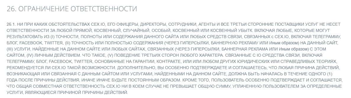 Согласно тому, что аферисты пишут в соглашении, скам-контора CEX не несет никакой ответственности за не полученную прибыль клиентом, а также за возможные убытки.