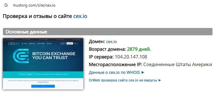 Проверка веб-сервиса обманщиков CEX на trustorg com показала, что возраст домена к моменту написания статьи составляет 2879 дней, вероятнее всего домен купленный.