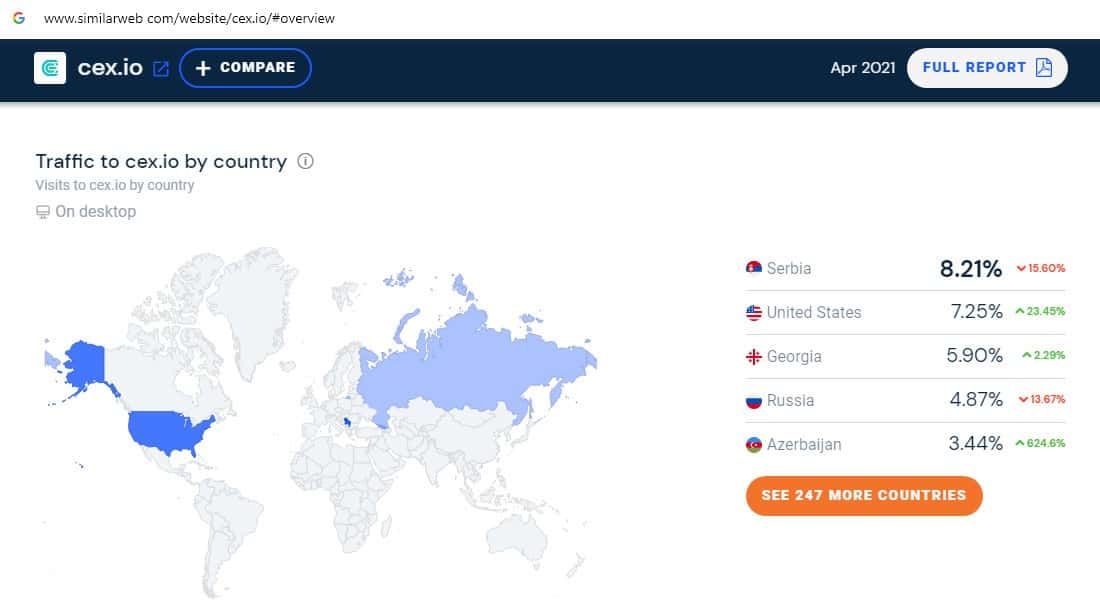 При проверке посещаемости интернет-ресурса крипто-биржи СиИИкс на similarweb com оказалось, что среди трафика есть пользователи из Сербии и США.