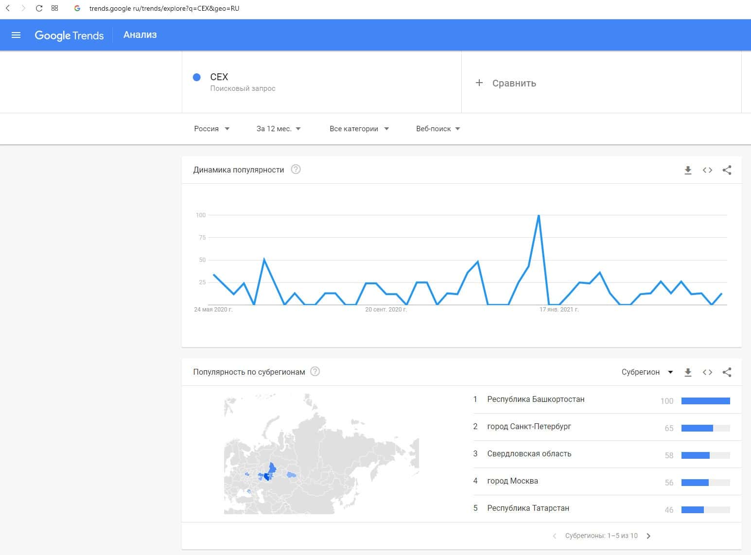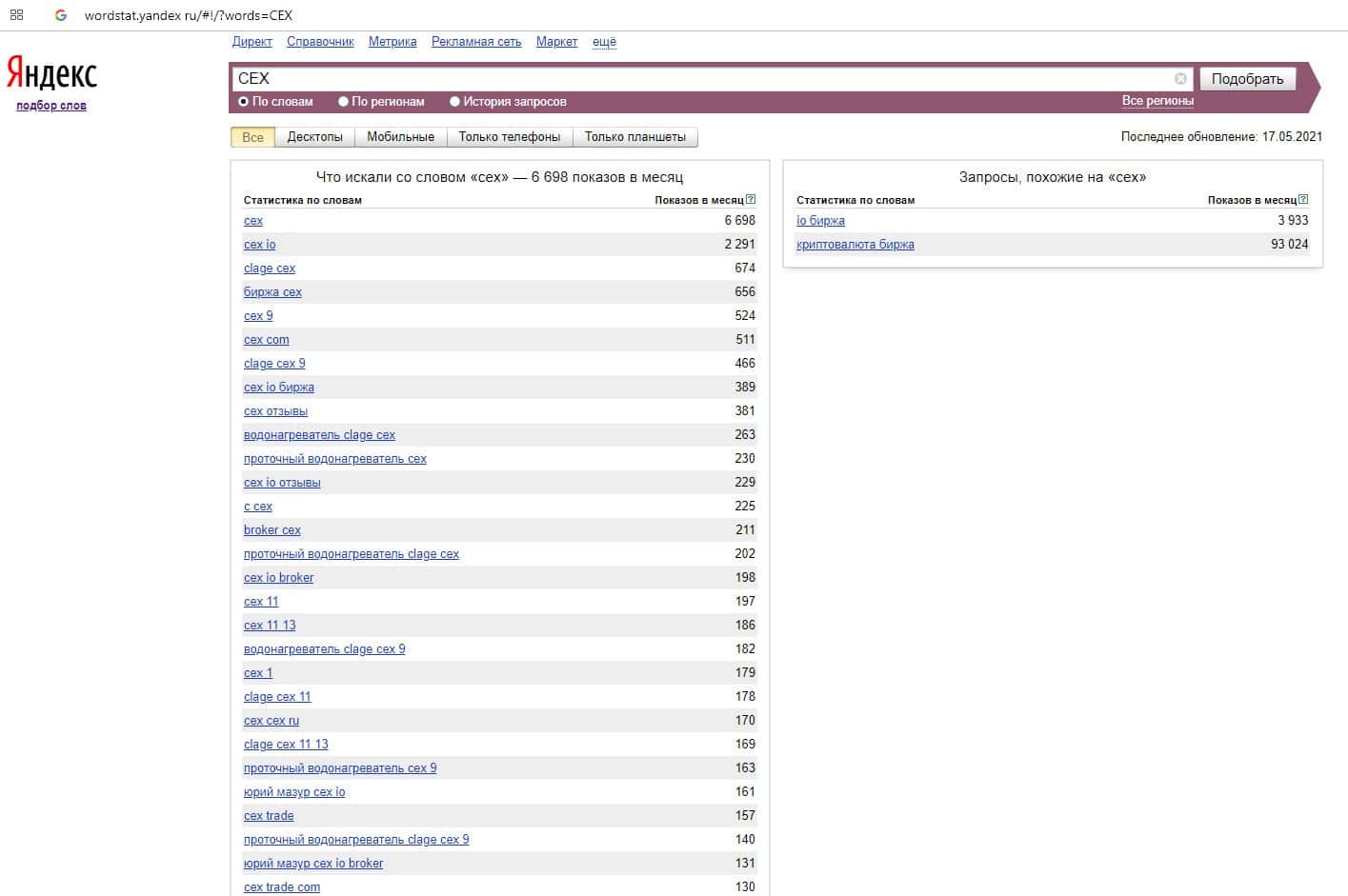 - Количество запросов по бренду CEX в поисковике Yandex