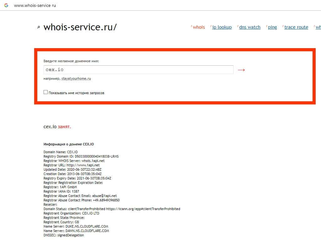 Проведя анализ данных по сайту CEX IO, не было обнаружено информации о владельце домена, что является еще одним признаком того, что имеем дело с лохотроном.