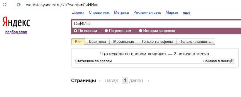 Количество брендовых запросов названия компании на русском языке "СиИИкс" на Вордстарт Яндекс Ру составляет всего 2 показа за месяц.