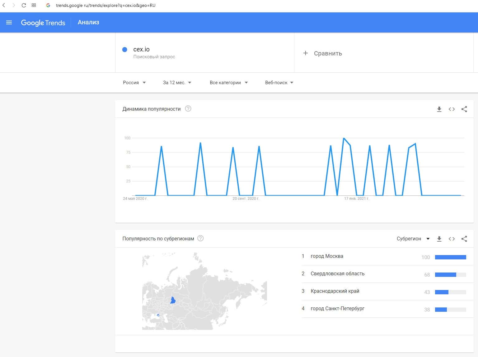Динамика популярности запросов по бренду название домена компании "cex.io" на Гугл Трендс отображена на графике предоставленном ниже.