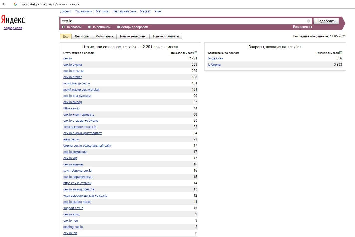 Количество запросов по бренду название домена компании "cex.io" на wordstat yandex ru составило 2291 запрос за месяц.