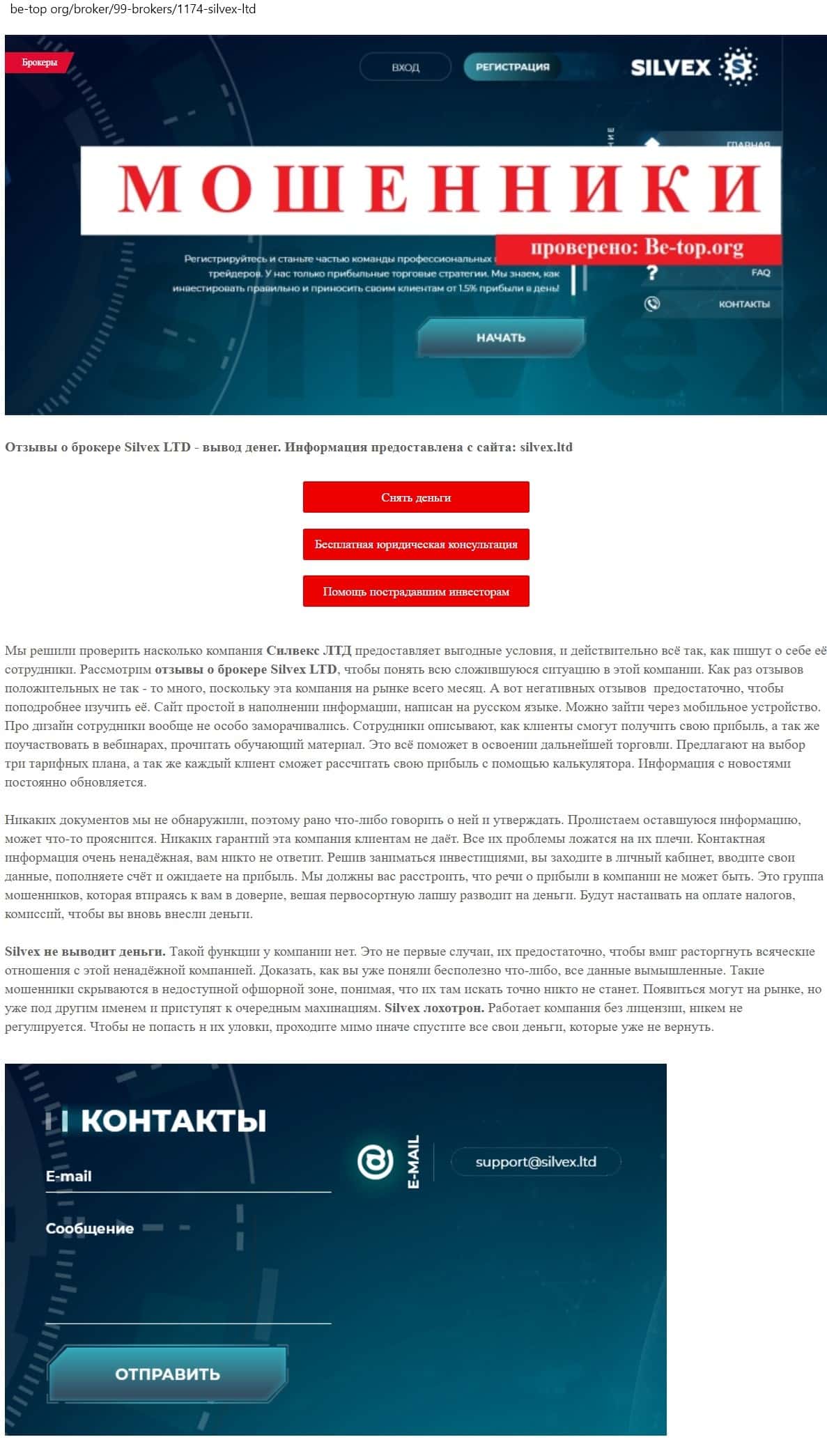Из всех видов контактов на сайте Silvex Ltd имеется только электронная почта. Отсутствие телефона и связи с техподдержкой - это подозрительные признаки.