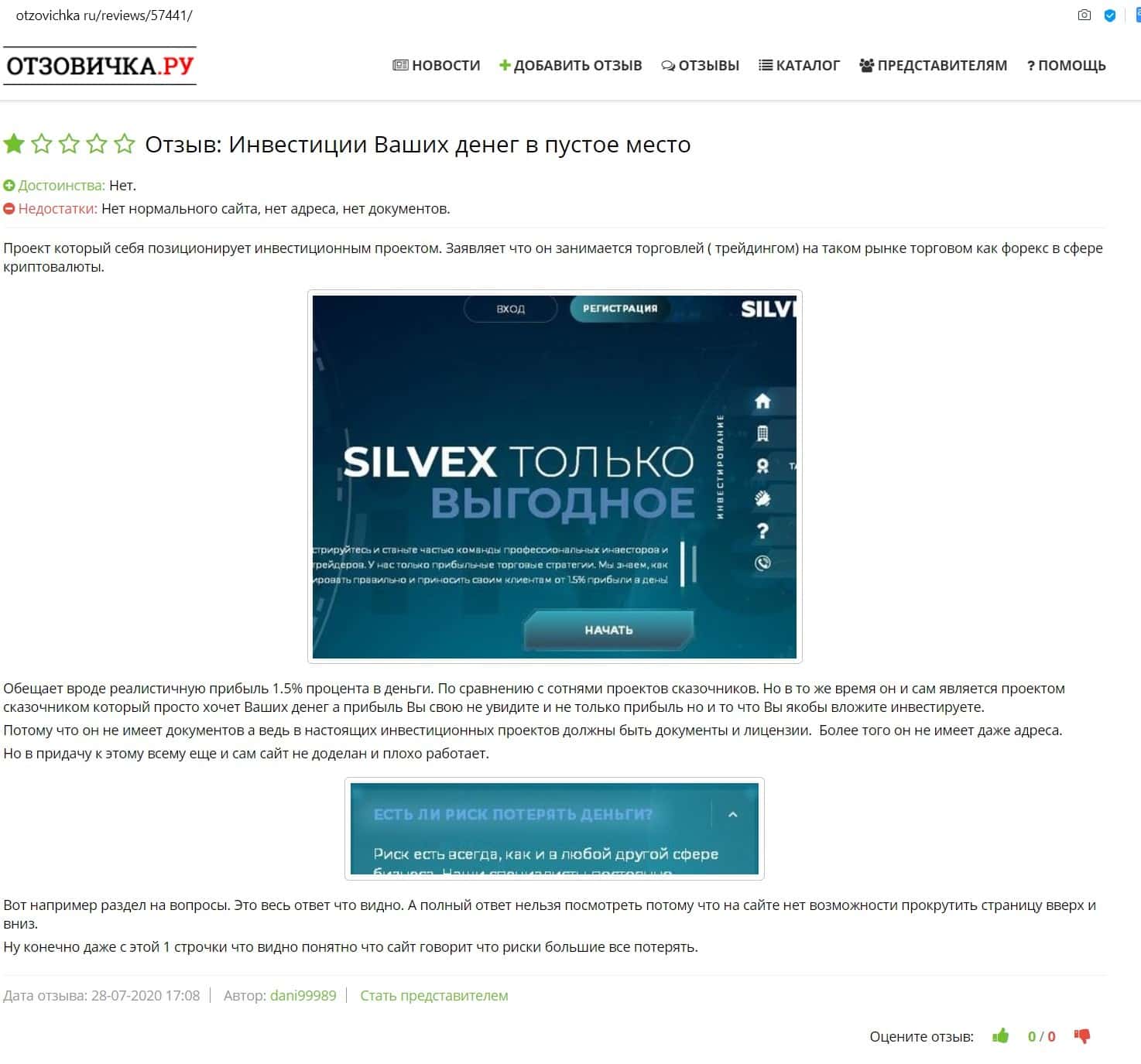 Отзыв на сайте Отзовичка говорит о том, что Silvex Ltd является скам проектом без лицензии и других документов, а его создатели рассказывают сказки доверчивым клиентам.