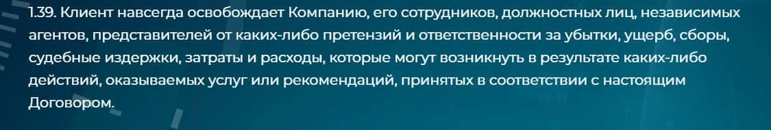 В пункте 1.39 администрация сайта Silvex Ltd заставляет клиента принять на себя всю ответственность за потерю средств и отказаться от каких-либо претензий.