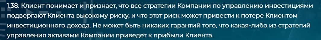Подписывая данный договор, клиент должен признать, что инвестирование имеет высокие риски и быть готовым к потере средств.