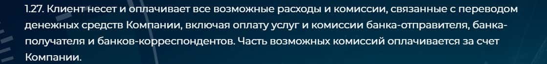 Пункт 1.27 говорит о том, что клиент обязуется оплачивать комиссии и другие расходы на сайте Silvex Ltd. Жулики используют этот пункт для того, чтобы отбирать средства клиента.