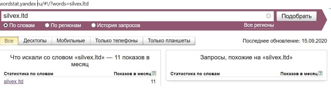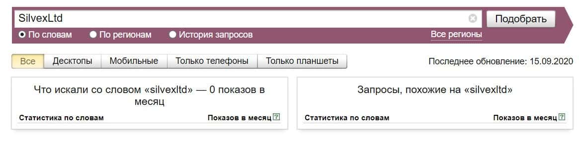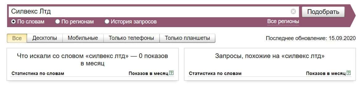 Название бренда на русском языке без пробела "СилвексЛтд", пользователи не искали в системе Яндекс ни разу.
