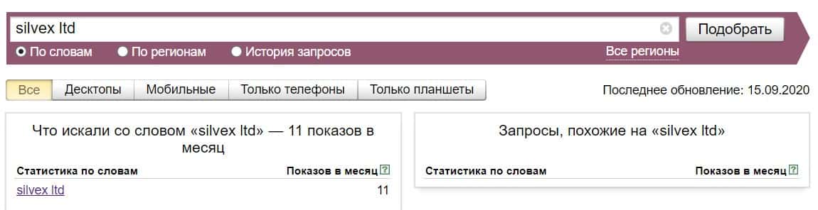 В поисковой системе Яндекс сайт брокерской конторы "silvex.ltd", вбитый в строку с точкой, пользователи искали всего лишь 11 раз за месяц.