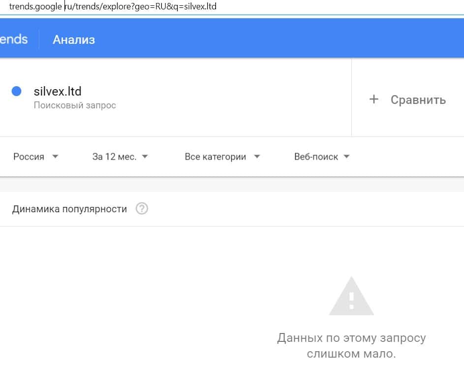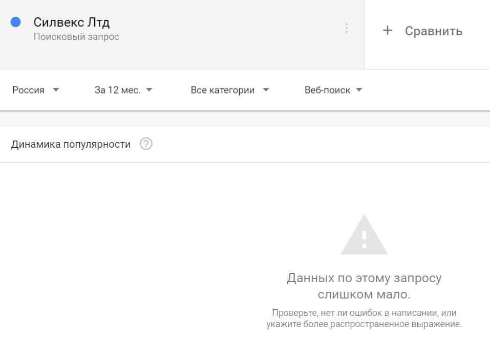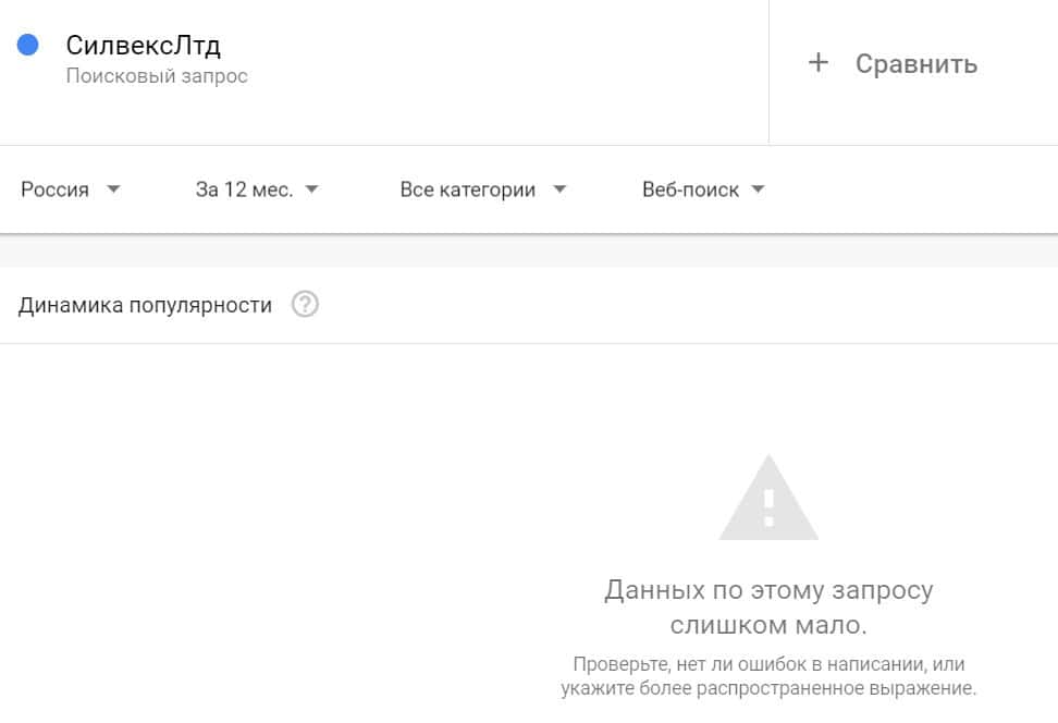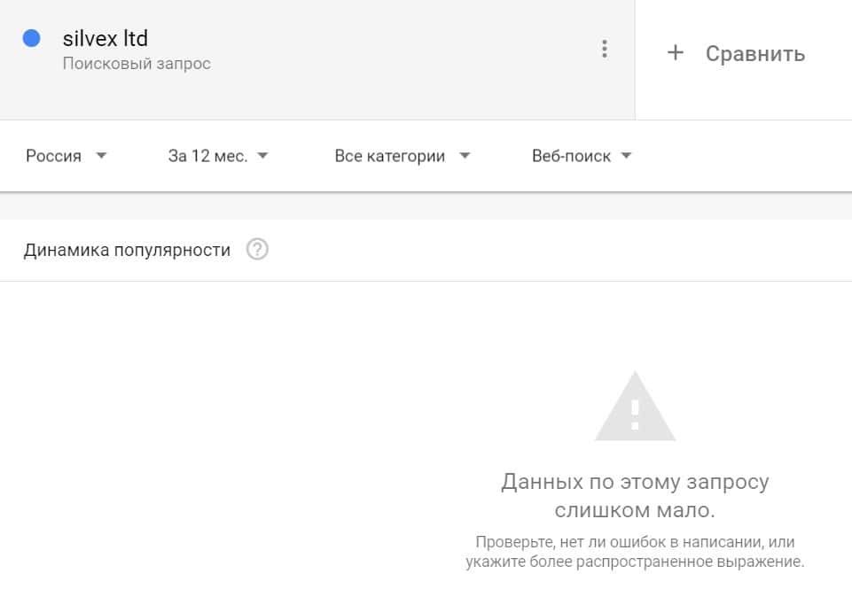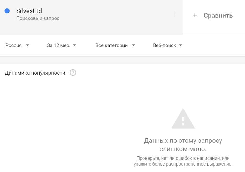 Посмотрим, насколько популярно название бренда "SilvexLtd", написанное на английском языке. Данных по этому запросу нет, так как в Гугл не было большого количества запросов.