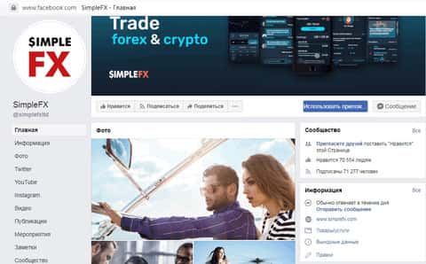 Социальное взаимодействие напрямую влияет на успех шарашек разного уровня. К этому вопросу ответственно подошли и жулики SimpleFX, создавшие себе целую армию будущих лохов. Например, на Фейсбуке у данной шарашки присутствуют целых 70 тысяч подписчиков.
