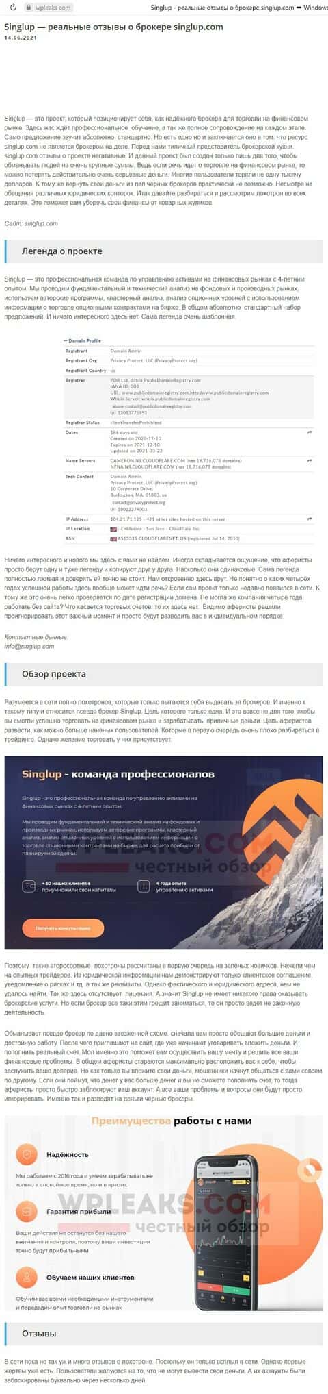 Ресурс singlup com не является не является брокером на деле. Это типичный представитель брокерской кухни - в этом можно убедиться, прочитав еще один обзор на сайте wpleaks com.