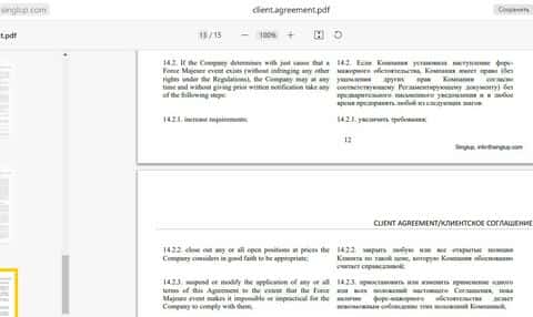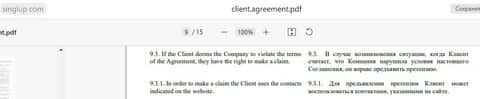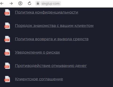 На своем говносайте аферисты Синг Ап выложили целый перечень документов. Вот только не все они переведены на русский язык. На это и рассчитывают хитрованы Сингл Ап, подсовывая для подписания кабальные условия, оставляющие клиентов ни с чем.