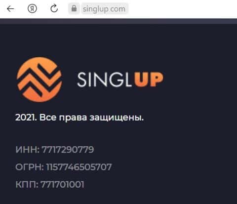 Мошенники Сингл Ап предпочли умолчать о том, кто является юридическим лицом их лохоразводника. Никакой информации на сайте об этом нет. Это еще один из признаков обычного кидального лохотрона.