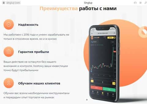 На сайте нет ничего о типах счетов, спредах и тому подобной информации. Вместо описания торговых условий лжеброкеры Сингл Ап кормят потенциальных жертв липовыми преимуществами.