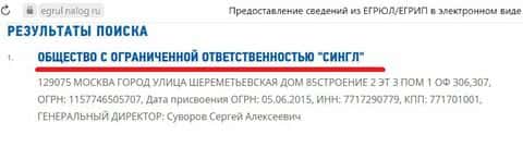 Мы решили проверить эти данные в ЕГРЮЛ. Действительно, компания с указанным ИНН: 7717290779, ОГРН: 1157746505707 и КПП: 771701001 зарегистрирована на территории РФ, но это ООО "Сингл".
