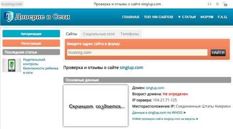- Сайт Доверие в сети не смог определить возраст домена singlup com
