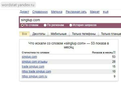 С помощью поисковой машины Яндекс сайт кидалова "singlup com" искали 53 раза, что тоже свидетельствует о крайней непопулярности данного фальшброкера.