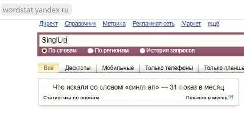 По англоязычному названию бренда "SinglUp" в сети Яндекс за месяц было сделано тоже 31 запрос.