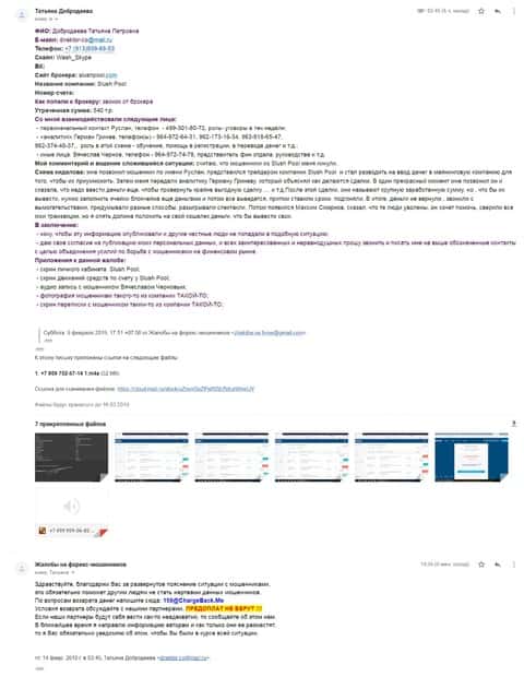 Если мошенники слили Вас, то не допустите, чтобы шулера SlushPool продолжали и дальше разводить таких же трейдеров как и Вы дальше, не прекращайте делиться своим личным плачевным опытом.