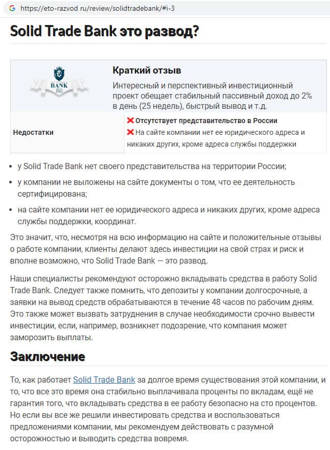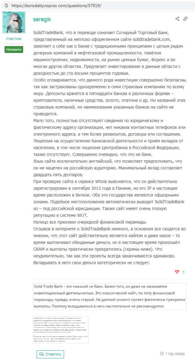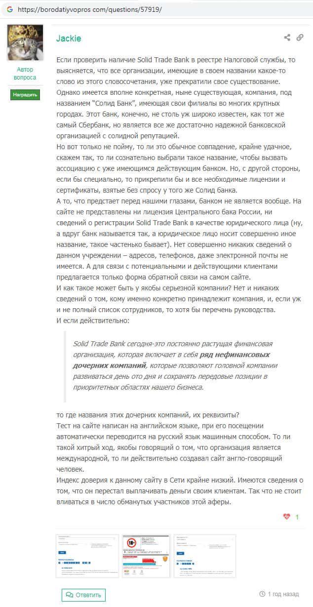 На сайте бородатыйвопрос ком найден отзыв о скам-конторе Солид Трейд Банк, автор которого пишет о том, что разочаровался в данной компании. Аферисты позиционируют себя как банк, которым на самом деле не являются. На какие-либо выплаты со стороны SolidTradeBank надеяться не стоит !!!