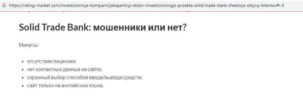Пользовательских отзывов о скам-конторе Солид Трейд Банк во всемирной паутине очень мало