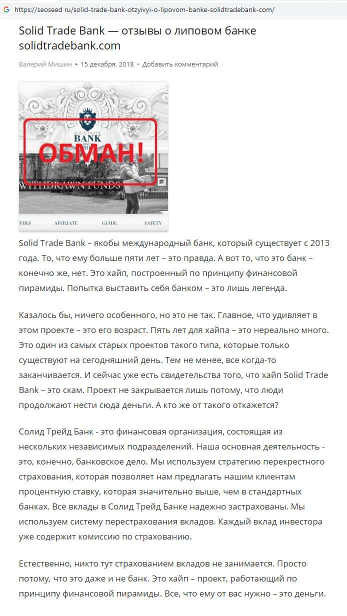 На информационном интернет-сервисе seoseed ru отыскана статья о мошеннической организации Солид Трейд Банк, на сайте которой слишком много лживой информации. Например, жулики врут о том, что их скам-компания имеет какой-либо отношение к банковской системе, что в действительности далеко не так.